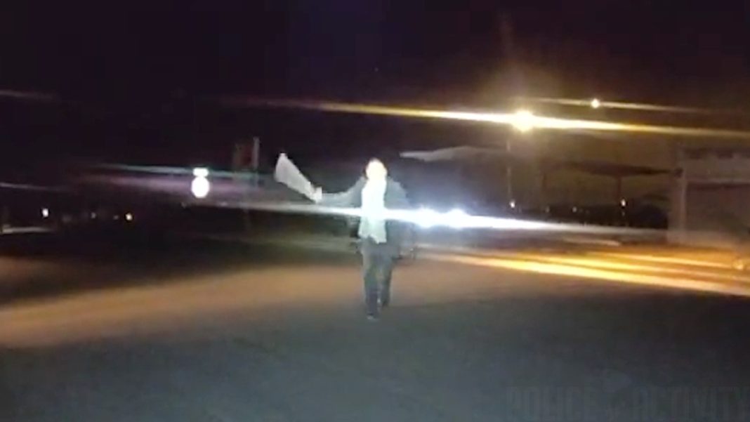 Surveillance and body-worn camera footage show 54-year-old Francisco Canales Aguilar leave his home carrying a machete, drive to the scene and approach the officer, swinging the blade and striking it on the ground.