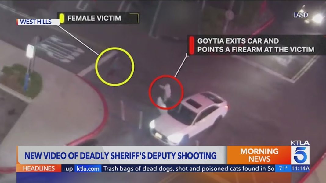 Surveillance and body-worn camera footage released by the Sheriff’s Department shows the suspect confronting the detectives as they were conducting surveillance related to a series of armed robberies, according to officials.