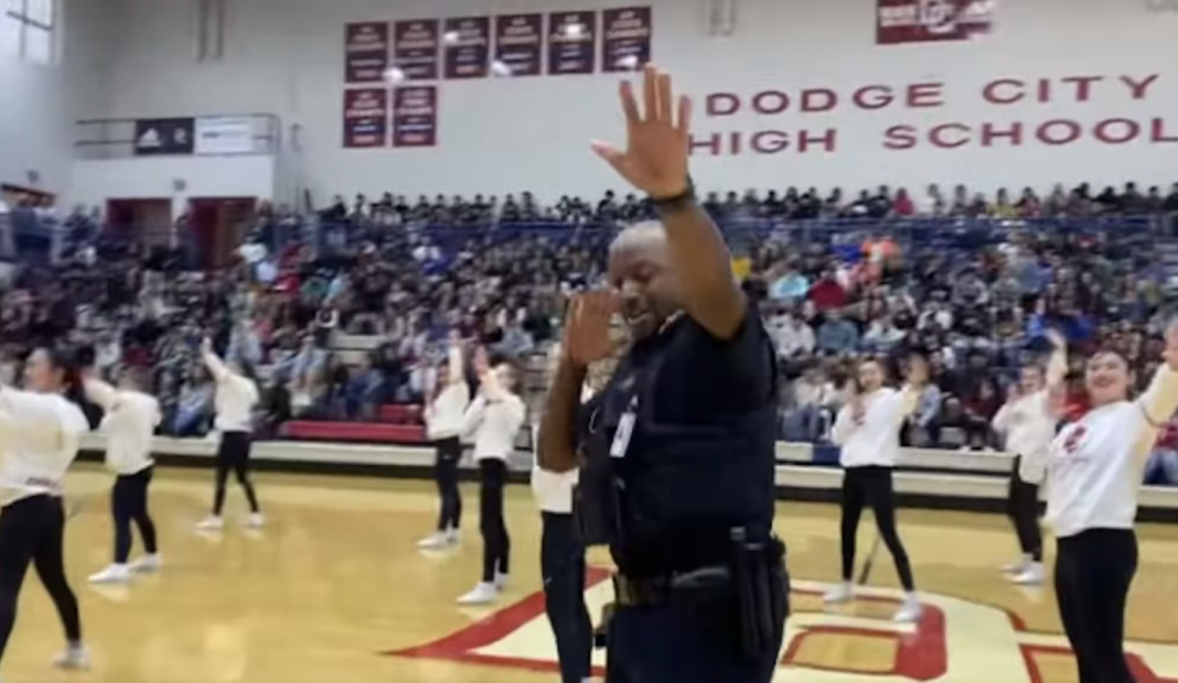 Shane Harris, a corporal with the Dodge City Police Department and a school resources officer, “walked it out” with the high school drill team during an assembly.